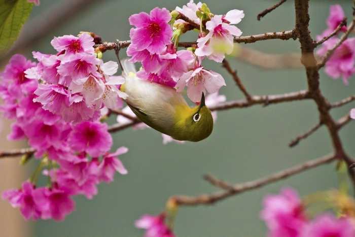 Se você já viu fotos de sakura com um passarinho verde de anel branco ao redor dos olhos, provavelmente era um mejiro.